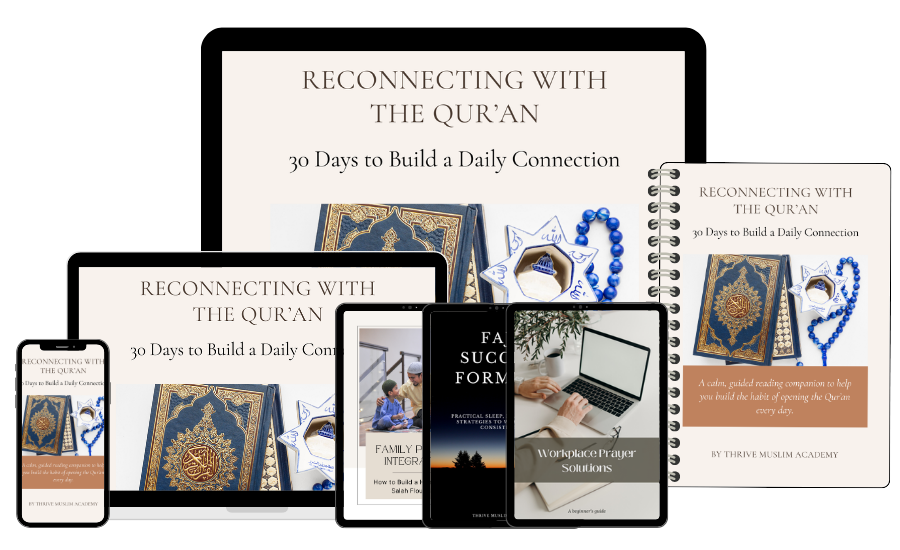 Instead of vague motivation, Thrive Muslim Academy gives you structured digital programs that combine Islamic principles, modern habit science, and realistic daily routines…so you can pray consistently, use your phone with intention, and feel spiritually centred — even with a busy life.